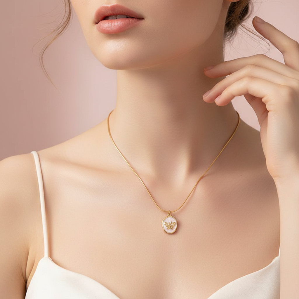 This feminine necklace brings a touch of whimsy and natural beauty to any outfit. The soft pink resin creates a romantic backdrop for the intricate butterfly charm, symbolizing transformation and grace. Perfect for layering or wearing alone, this delicate piece adds a subtle pop of color and elegance to your everyday style or special occasions.
